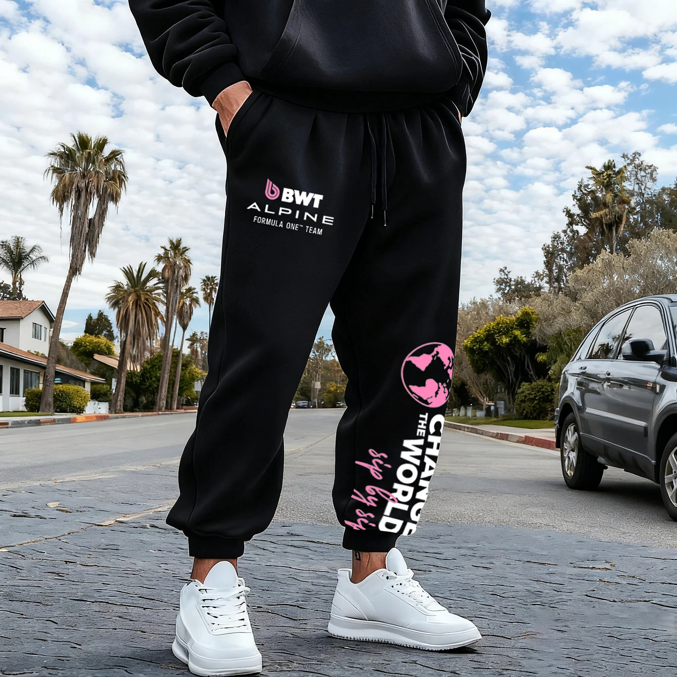 • Design Elements: Bold graphic print on the side, drawstring waistband, elastic cuffs