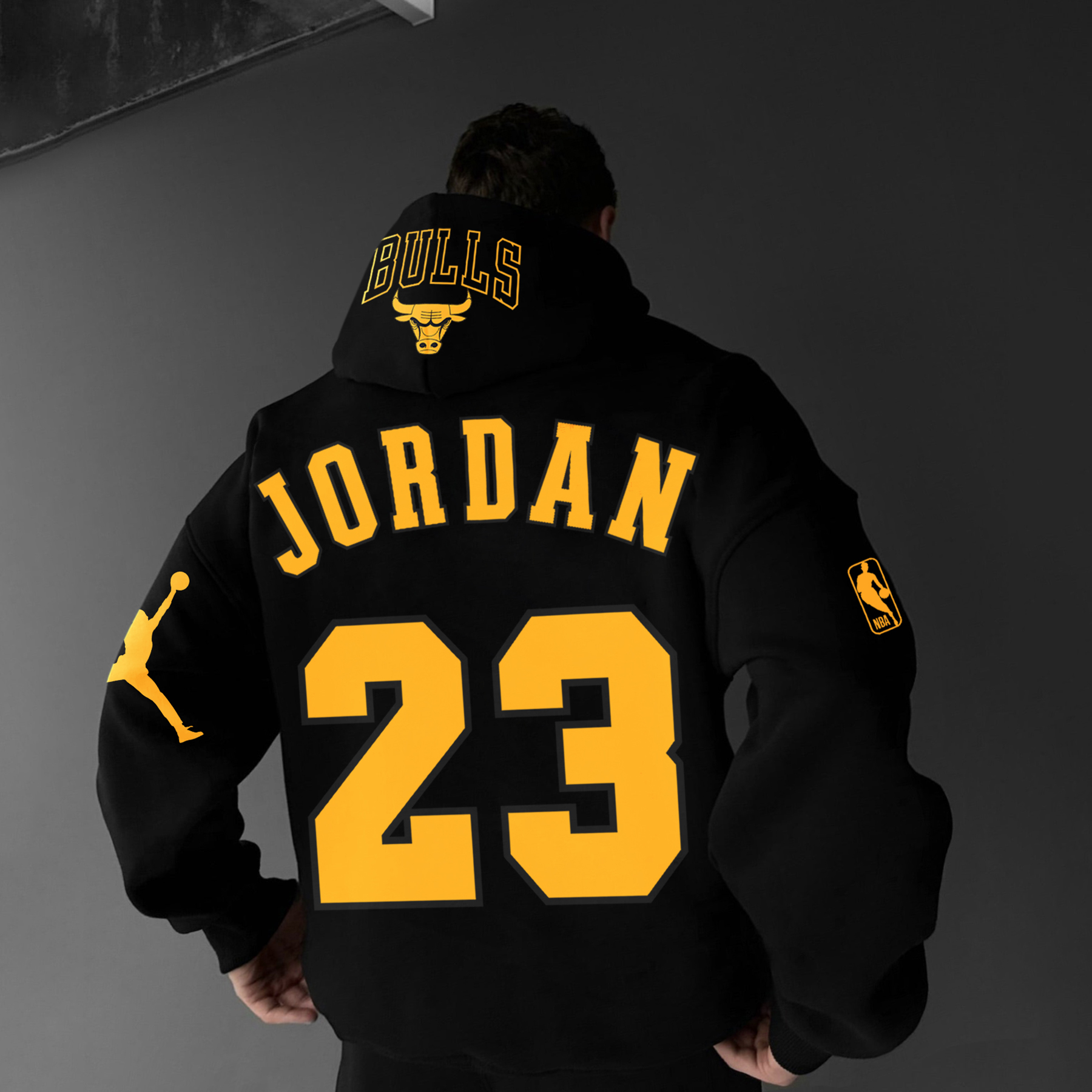 Show your love for basketball with the Men’s AJ* 23 Bulls Hoodie, featuring an iconic black and gold colorway. This hoodie is designed with bold "JORDAN" lettering, the legendary number 23, and Bulls branding on the hood. A Jumpman-style logo on the sleeve and an NBA patch complete the sporty look. Made from premium fleece-lined cotton, this hoodie is both stylish and functional—perfect for casual wear, streetwear, or game day.