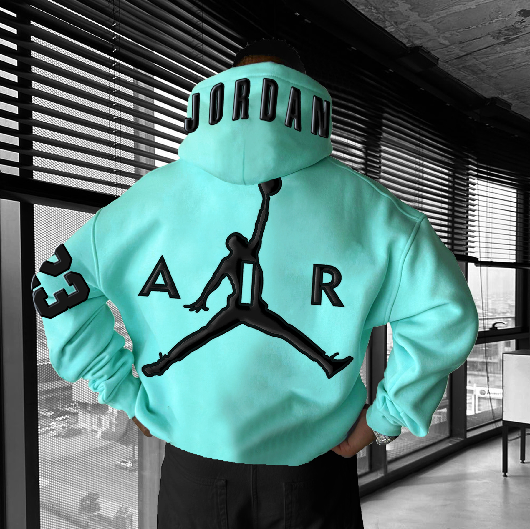 Embrace the iconic Jordan brand with this striking black hoodie, featuring bold blue accents on the "AJ* " text and "23" on the back. The standout Jumpman logo completes the look, making it clear that you’re repping one of basketball's most legendary figures. Crafted from soft, durable fabric, this hoodie combines comfort with style, perfect for casual outings or athletic wear. The logo on the hood adds an extra touch of basketball pride, making this hoodie a must-have for fans of the sport.