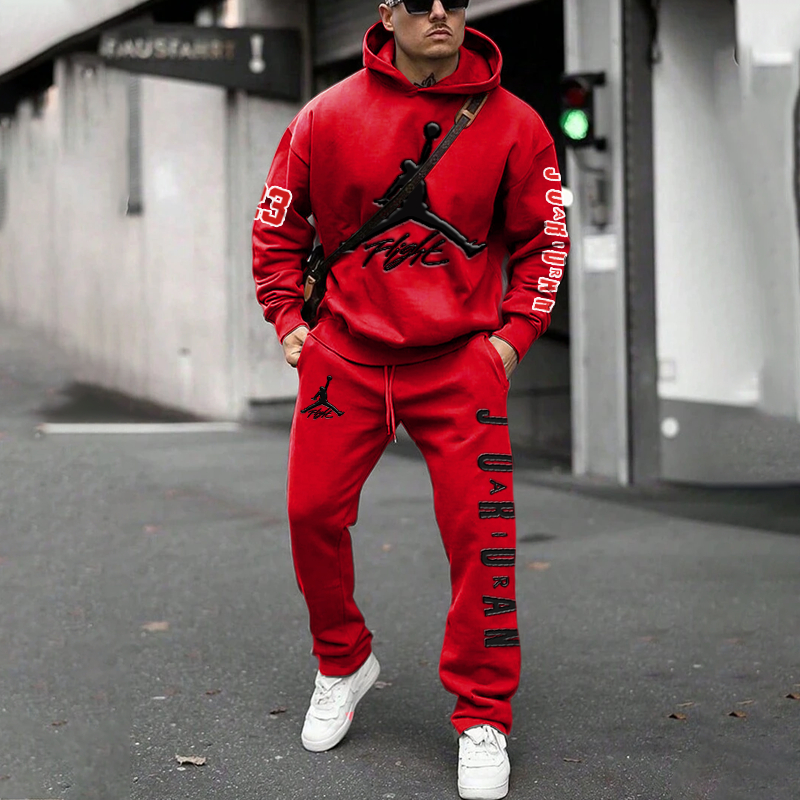 This AJ* hoodie and sweatpants set brings together comfort, style, and iconic basketball branding. The hoodie features a bold Jumpman graphic on the chest, with "Flight" text for an extra touch of style. The sleeves showcase the bold " AJ* " text, while the sweatpants are designed with a matching Jumpman logo and the " AJ* " text running down the sides. The set is perfect for casual outings, athletic activities, or showcasing your love for the AJ* brand.